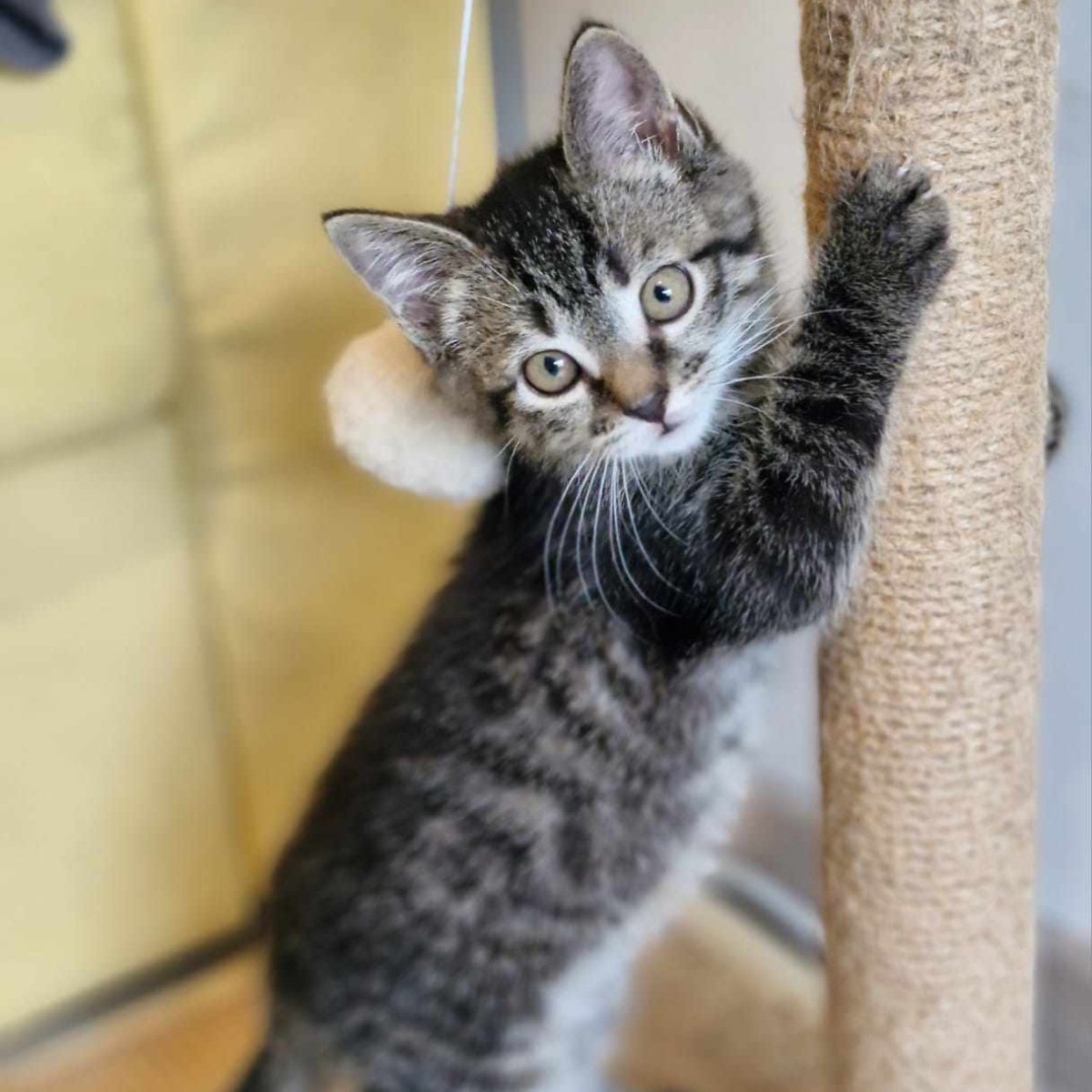 Steeds aanwezig als er gespeeld wordt onderling, maar ook op zichzelf kan hij zich heerlijk amuseren met een balletje of muisje. Als er een warme schoot in aanbieding is dan is hij als eerste van de partij om van knuffels te genieten.