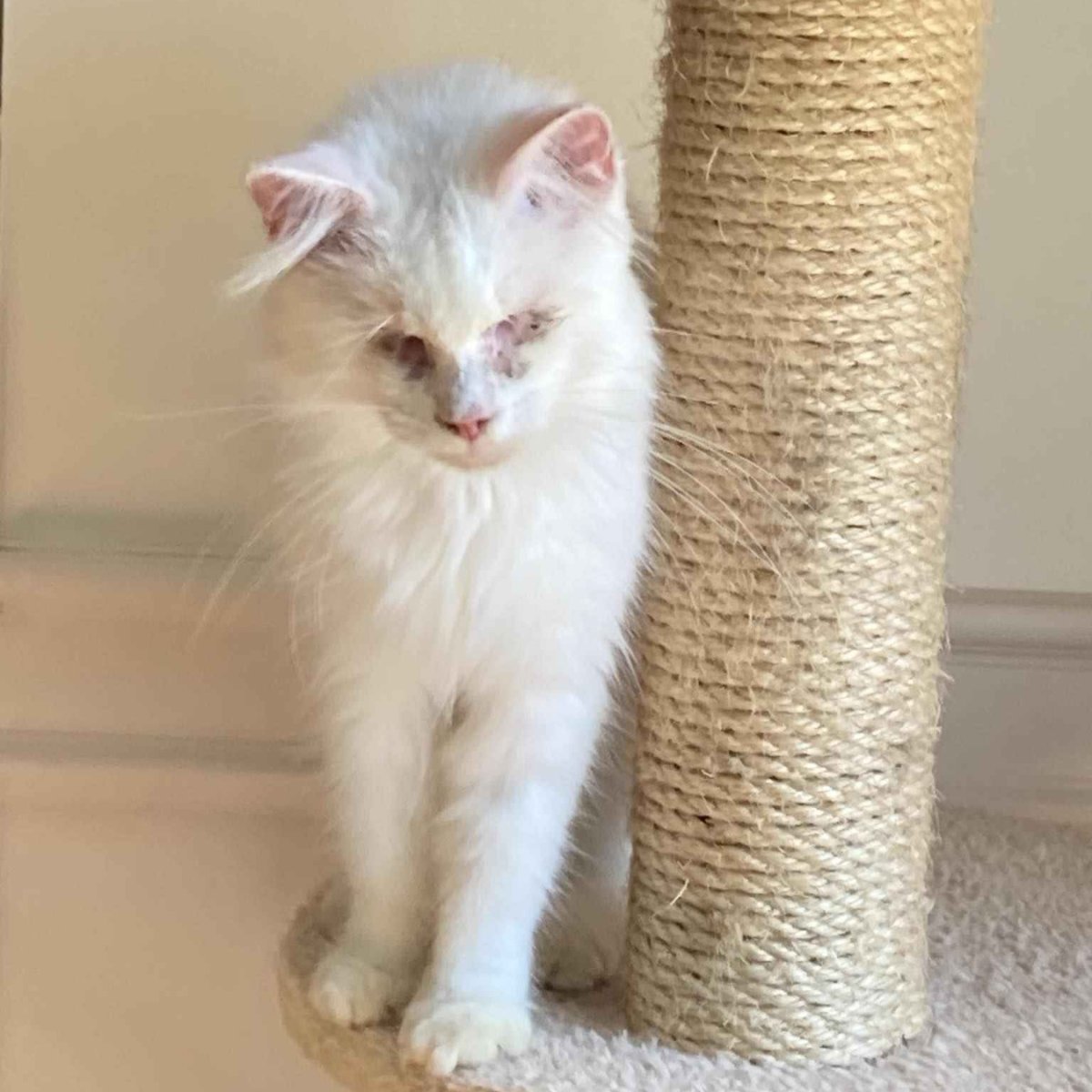 Laurel heeft wat extra zorg nodig want zoals je kan zien op haar foto is deze lieverd blind. Ze is namelijk zonder oogjes geboren en is dit dus goed gewoon.