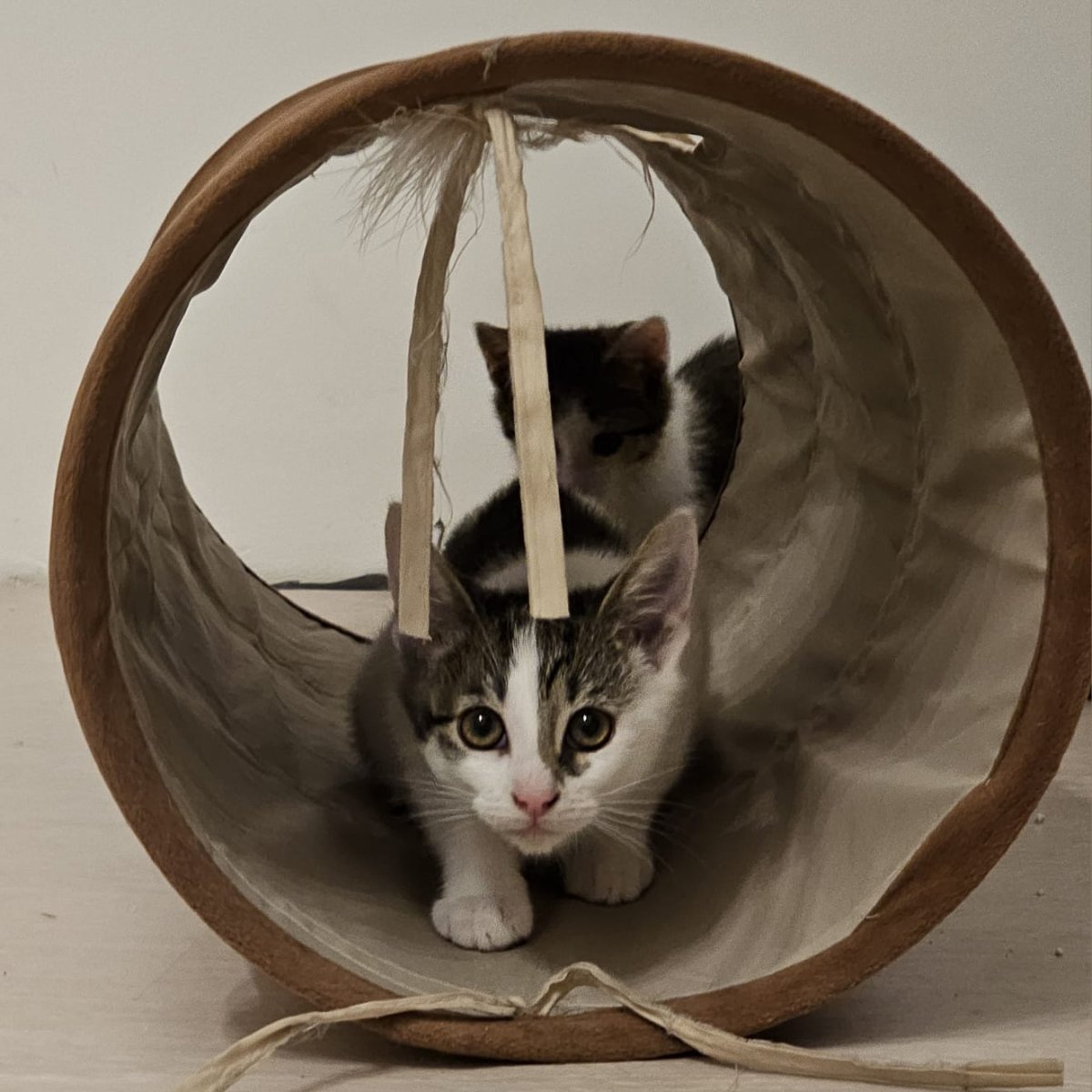 Dit is Daan! Samen met Roos zijn dit 2 speelse kittens! Een balletje, een speelgoedmuisje en een hengeltje kan hun uren zoet houden.