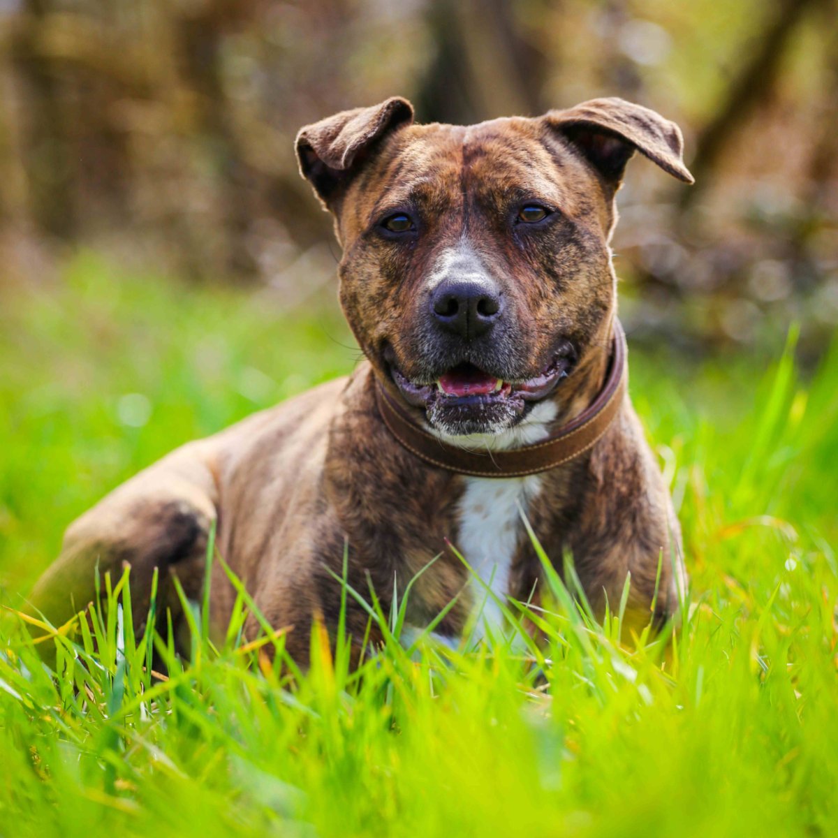 Suzy is een super knappe stafford mix. Ze werd bij ons afgestaan omdat ze het moeilijk had om zich aan te passen sinds de komst van een kindje.