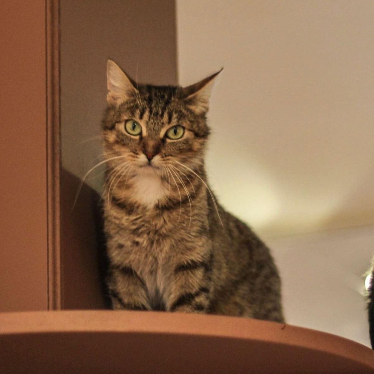 Serafina laat zich af en toe nieuwsgierig zien wanneer ze vanuit de kattenkamer even komt piepen. Het liefst kiest ze nog voor een plekje hoog in het café, vanwaar ze alles rustig kan observeren. Ze is nog verlegen, maar leert stap voor stap haar nieuwe omgeving beter kennen. Met wat tijd en vertrouwen zal Serafina waarschijnlijk uitgroeien tot een aanhankelijke kat die volop van aandacht en knuffels kan genieten.