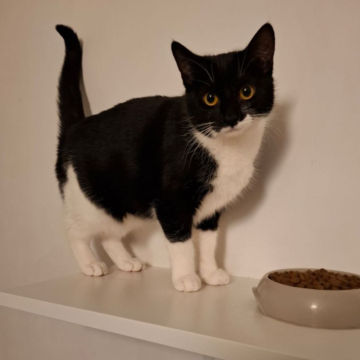 Tijm is een mooie zwarte kattin met witte kin. Het is een rustige en sociale kat. Tijm heeft voorspelbaarheid nodig.